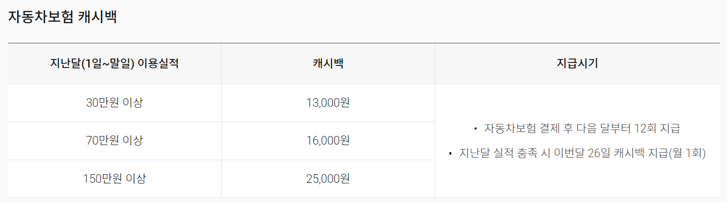 자동차 보험료를 20만원 이상 결제한 달의 다음달 부터 매월 최대 2만 5,000원까지 캐시백 혜택을 받을 수 있는데요, 캐시백은 최대 12회까지 지급됩니다.