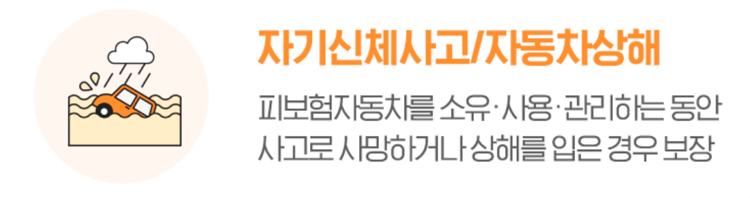 피보험자가 피보험 자동차를 소유, 사용, 관리하는 동안에 생긴 다음 중 어느 하나의 사고로 인하여 사망하거나 상해를 입을 때 그로 인한 피해를 보상합니다. 다만, 피보험자가 피보험 자동차에 탑승 중일때에 한합니다.