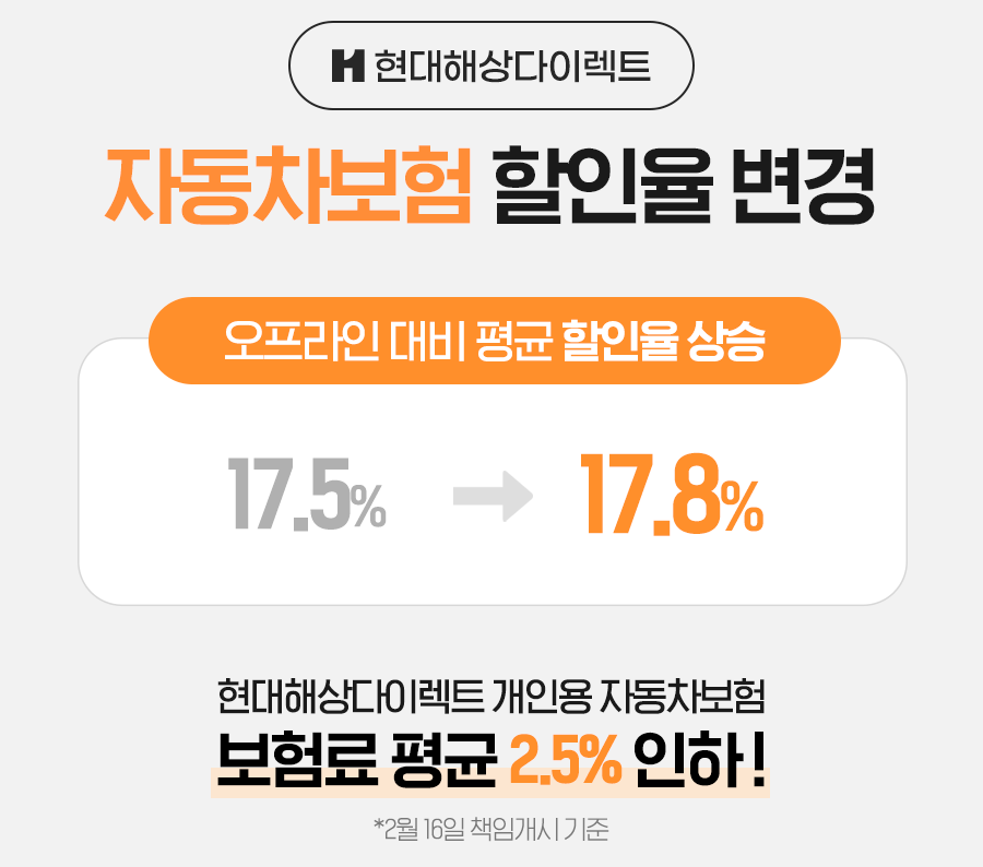 현대해상 다이렉트 자동차보험의 보험료가 2월 16일을 기준으로 오프라인 대비 평균 할인율이 17.5% 에서 17.8% 로 변경되었습니다.