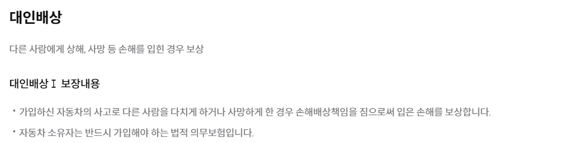 - 대인1(의무보험): 자동차손해배상보장법 제3조에 따라 반드시 가입해야 하는 의무보험입니다. 보상 한도는 사망 및 후유장애 시 최고 1억 5천만 원, 부상 시 최고 3천만 원입니다.
