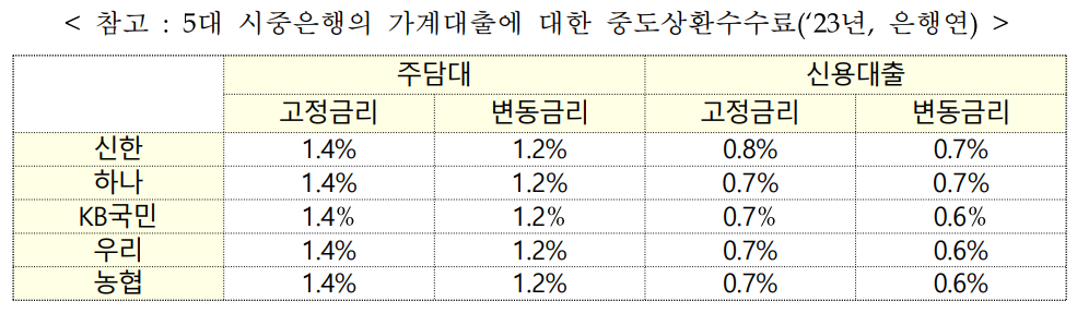 현재 은행별 중도상환수수료는 약간씩 차이가 있는데, 주담대 기준 고정금리형은 1.4%, 변동금리형은 1.2% 수준이며, 신용대출은 0.6~0.8% 수준으로 적용되고 있습니다.