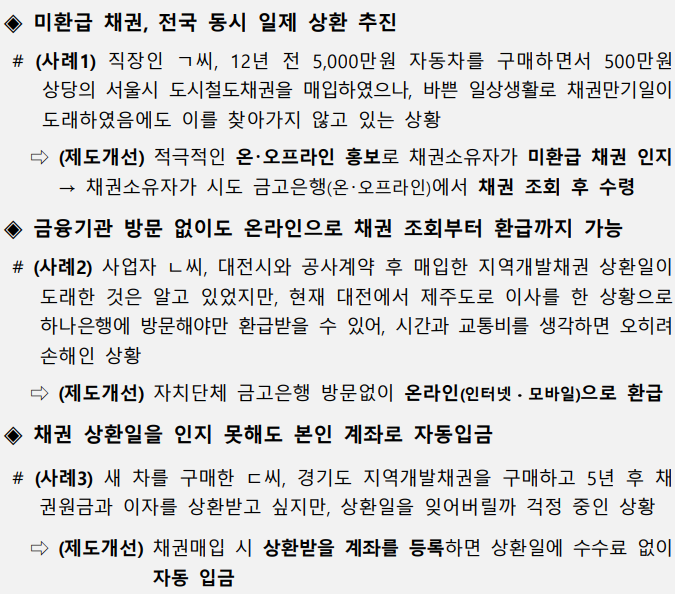 ✔️ 지역개발채권: 경기도 및 그 외 지역에서 적용되며, 자동차 외에도 인/허가를 받거나 공사/용역/물품 계약을 체결해야 하는 경우에도 의무적으로 매입해야 함